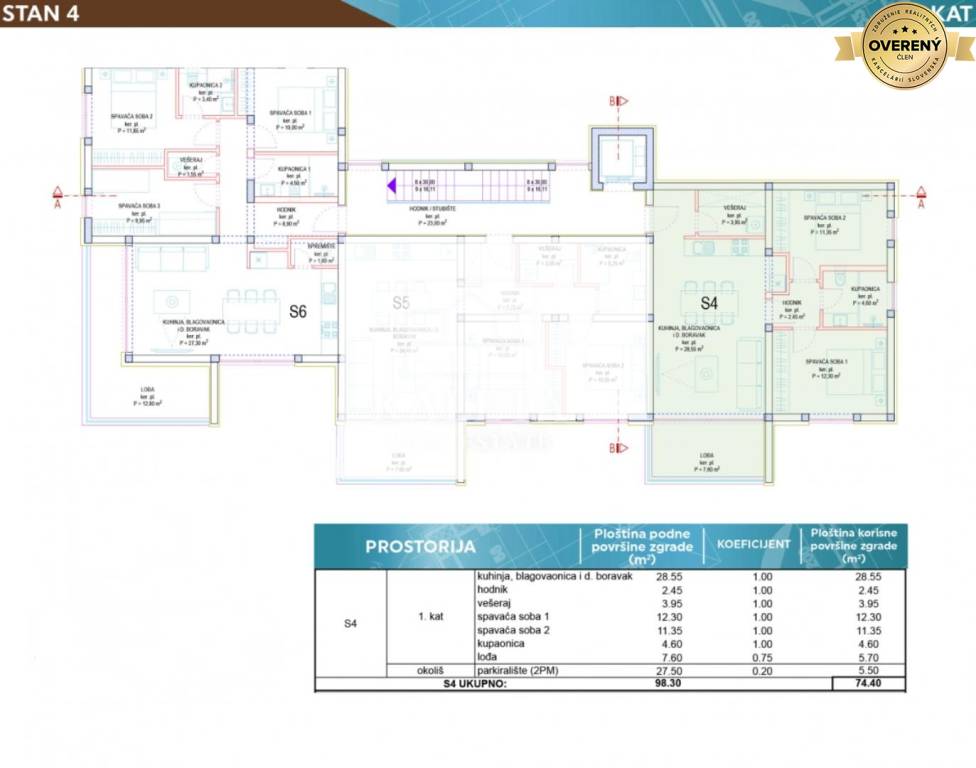 Apartment S4 is located on the 1st floor. The area of the apartment is 63.20 m2 + loggia 7.60 m2.