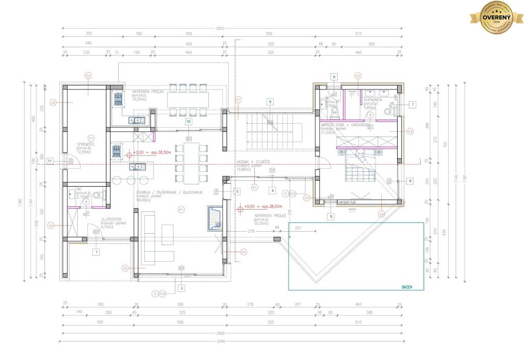 The internal usable area of the villa is 217.70 m2 + covered terrace at the back of the villa 16.90 m2 + covered terrace at the front of the villa by the pool 32.50 m2. On the upper floor, it is possible to add a terrace or another living area.